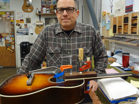 SCGC makes world-class acoustic guitars and so far I’ve had the privilege to work on some really amazing instruments. Here’s a photo of me at my bench.