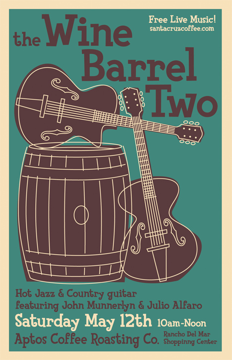Introducing The Wine Barrel Two, my new guitar duo with Julio Alfaro. We will be playing the 2nd and 4th Saturdays of every month at the Aptos Coffee Roasting Company in the Rancho Del Mar Shopping Center (next to Safeway) in Aptos. We play from 10am to Noon, so drop by for a cup of joe and some live music.